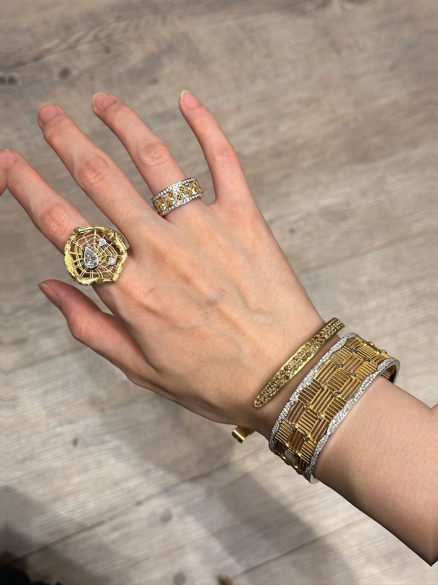 这款戒指采用优质 18k 黄金打造而成,配有醒目的戒圈,镶有耀眼的钻石和蓝宝石,散发出夺目的光芒,引人注目。